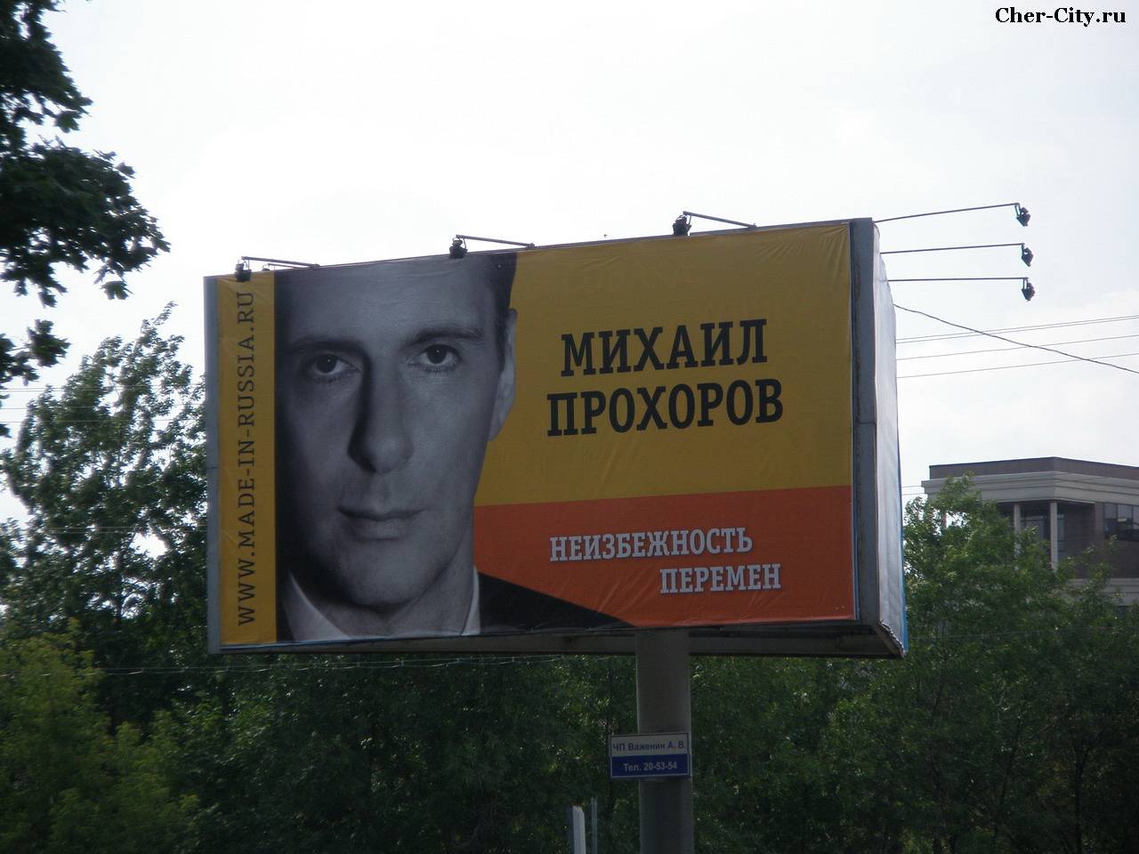Продолжаем тему баннеров. С 1 августа началась рекламная кампания Михаила Прохорова. В Череповце появились баннеры с фотографией Прохорова и лозунгами "Неизбежность перемен" и "Сила в правде. Кто прав, тот и сильнее".
