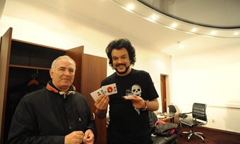 По просьбе художника корреспондент газеты «Речь» загодя связался с менеджментом Филиппа Киркорова и выслал снимок портрета. Там заинтересовались и пригласили нас в гримерку за полчаса до концерта. В арт-уборную мы с Валерием Дворяновым попали за пять минут до обозначенного на афише времени выхода Филиппа на сцену. Но он не торопится — безо всякой спешки гладит лицо косметической кисточкой. На большом круглом столе стоят несколько блюд с закусками — налицо все ингредиенты для приготовления шикарных бутербродов на целый полк. Мясо кусочками, сыр, хлеб, овощи... Содержимое блюд не тронуто: то ли Киркоров не голоден, то ли официанты с молниеносной скоростью восполняли съеденное. Дарителя артист встречает с распростертыми объятиями, признавшись, что портрет видел лишь на снимке и жаждет взглянуть на оригинал. «Как вы это делаете?» — недоуменно воскликнул артист, прильнув к увеличительному стеклу (невооруженным глазом портрет не увидеть). Валерий Дворянов рассказал, что пишет картины волосом, который рвет из собственной руки. Изумлению Филиппа Киркорова не было предела. «Никогда не видел ничего подобного, — признался он. — Мы это обязательно распиарим, этот портрет появится в прессе, это же потрясающе». Ответным подарком художнику от Филиппа Киркорова стал помимо рукопожатия мэтра и совместной фотографии билет на шоу. О подарке и Валерии Дворянове певец вспомнил и во время концерта, упомянув о Книге рекордов Гиннесса.