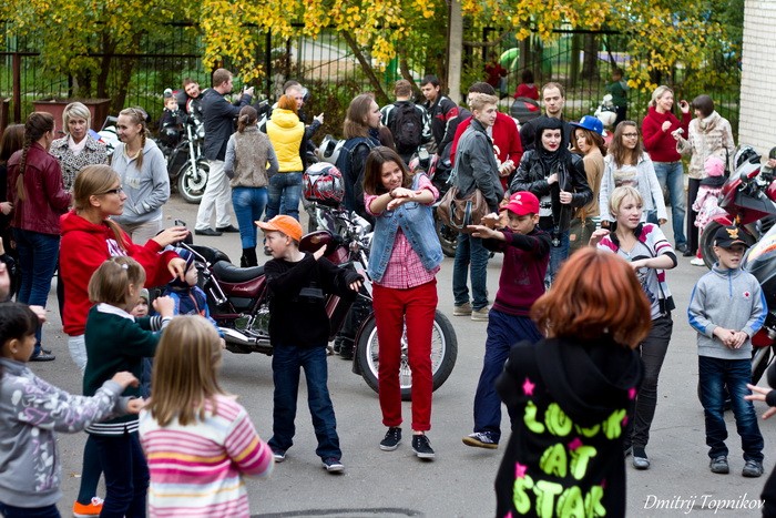 Мотоциклисты, рэперы, участники вокальных групп приехали в детский дом, чтобы спеть ребятам любимые песни, покатать девчонок и мальчишек на байках и дать погазовать, чтобы потанцевать и поиграть вместе. Провели для них веселые конкурсы.