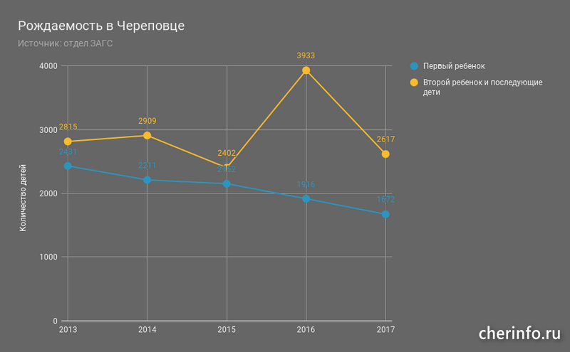 В 2017 году в Череповце родилось 4293 ребенка, такие итоги подвели в городском отделе ЗАГС. В 2016 году новорожденных было на 697 больше.