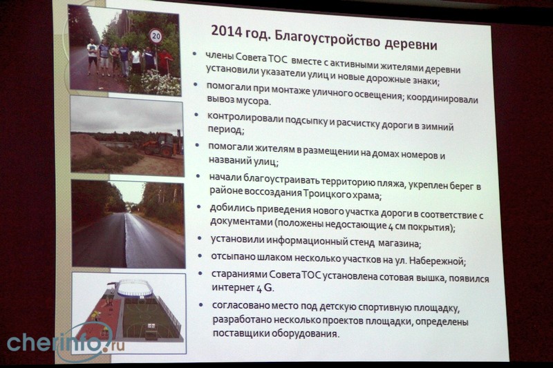 «Много внимания мы уделяли экологии. За сезон проведено девять субботников, как по нашей инициативе, так и по инициативе жителей Череповца, отдыхающих на наших берегах. Многие присоединились к нам в процессе. Также мы установили два щита с социальной рекламой, один в лесу у тропы здоровья, а второй — на берегу Рыбинского водохранилища. Также наш ТОС принял участие в конкурсе Законодательного Собрания «Чистый лес», мы отмечены дипломом участника».