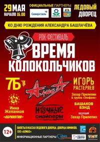 (8202) 32-32-32, 32-32-40 Ежегодный рок-фестиваль «Время колокольчиков», посвященный дня рождения Александра Башлачева, пройдет в «Ледовом дворце» Череповца 29 мая. Хедлайнером фестиваля выступит знаменитая рок-группа «Алиса».