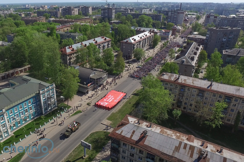 В Череповце в акции «Бессмертный полк» 9 мая 2016 г. приняли участие шесть тысяч человек. Колонна участников и большая копия знамени Победы на улице Ленина, вид сверху.