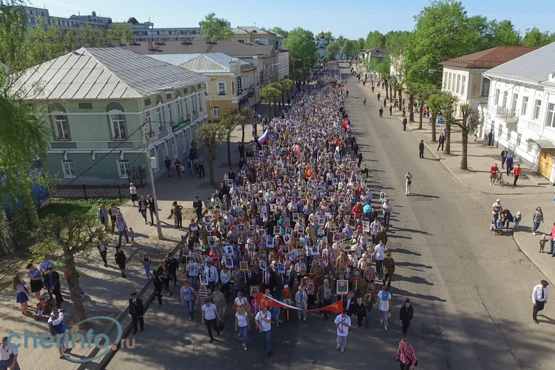 В Череповце в акции «Бессмертный полк» 9 мая 2016 г. приняли участие шесть тысяч человек. Вид сверху на колонну, проходящую по Советскому проспекту.
