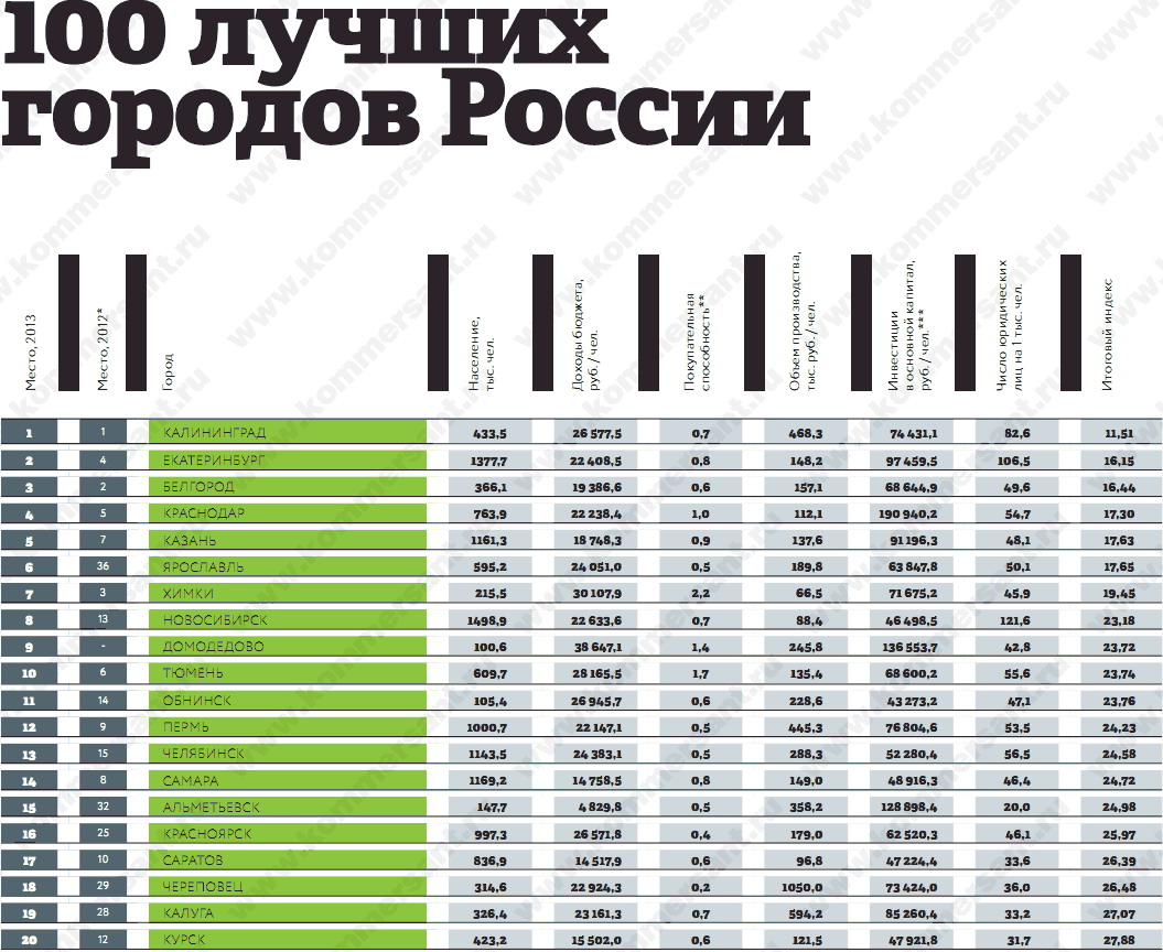 Первая двадцатка рейтинга "100 лучших городов России", публикуемого деловым журналом "Коммерсантъ. Секрет Фирмы".