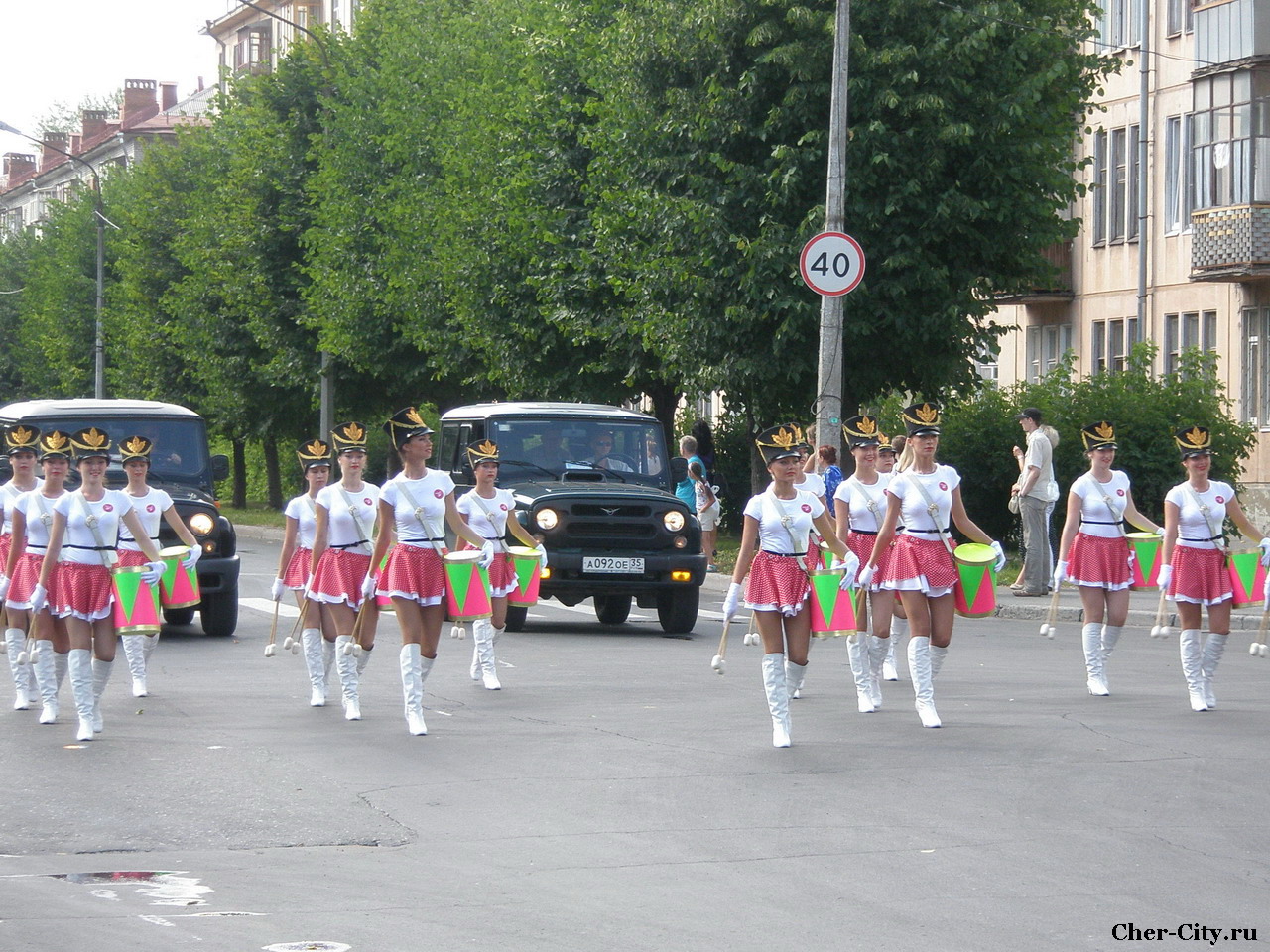 Девушки с барабанами впереди колонны, перекресток улицы Ленина и бульвара Доменщиков.
