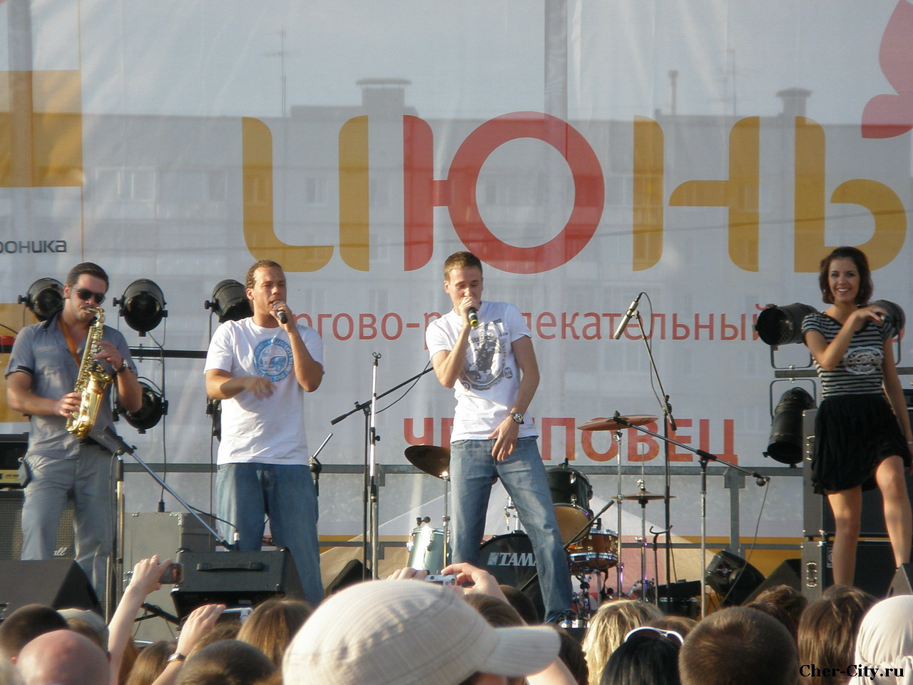 На череповецкой сцене группа "Т9" в полном составе. Около 20 часов вечера она заканчивала праздничный концерт в честь открытия ТРЦ "Июнь".