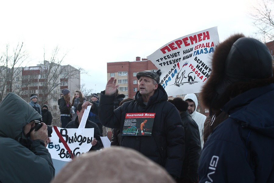Пикет "За честные выборы!" на площади Химиков 11 декабря 2011 года. Череповецкий оппозиционер Анатолий Ясин выступает с речью.