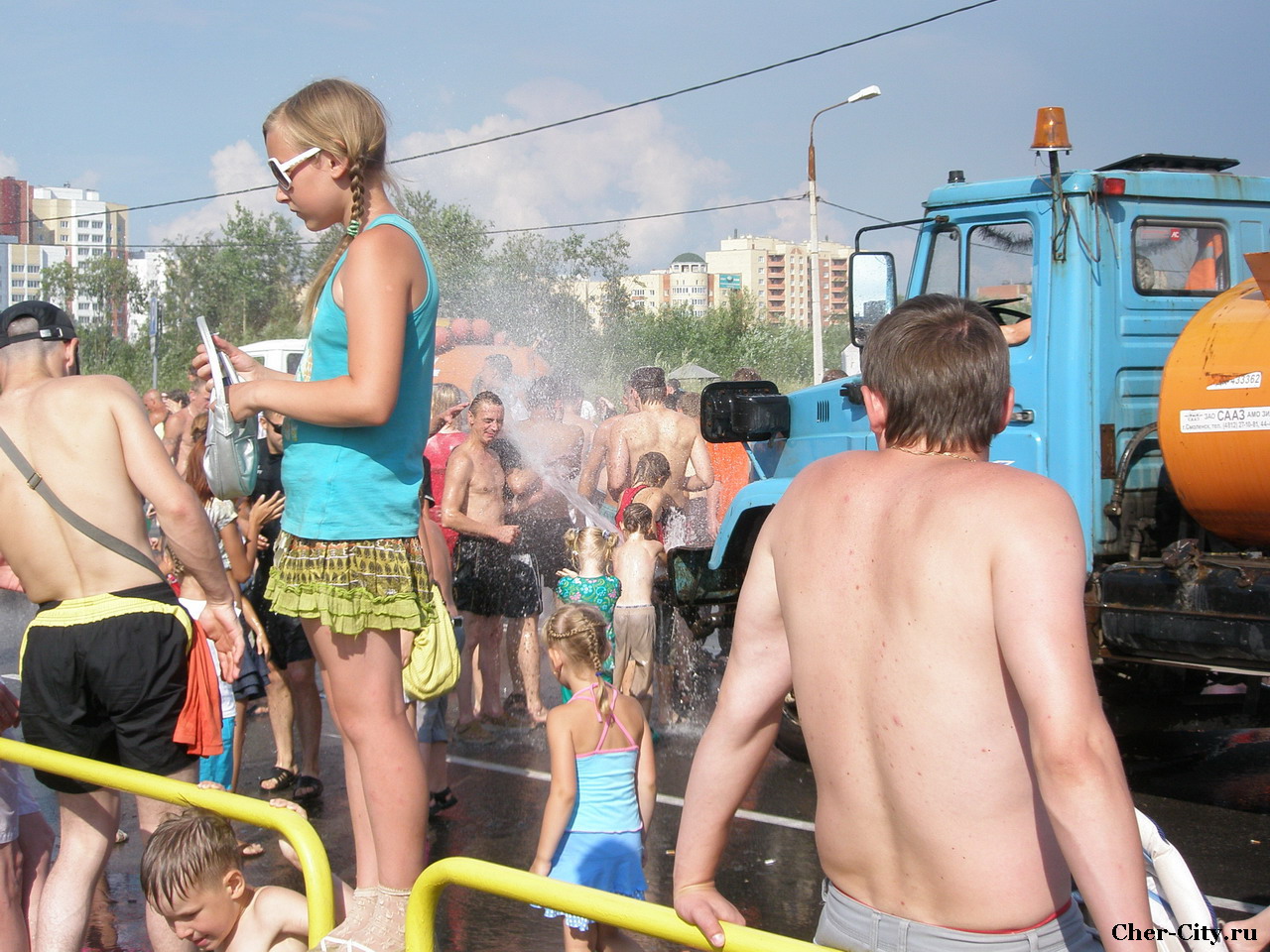 Температура в день открытия "Июня", как и в предыдущие дни, составляла 30-32 градуса Цельсия. Разгоряченные горожане охлаждались разными способами. На фотографии запечатлён один из самых эффективных и безопасных для здоровья.