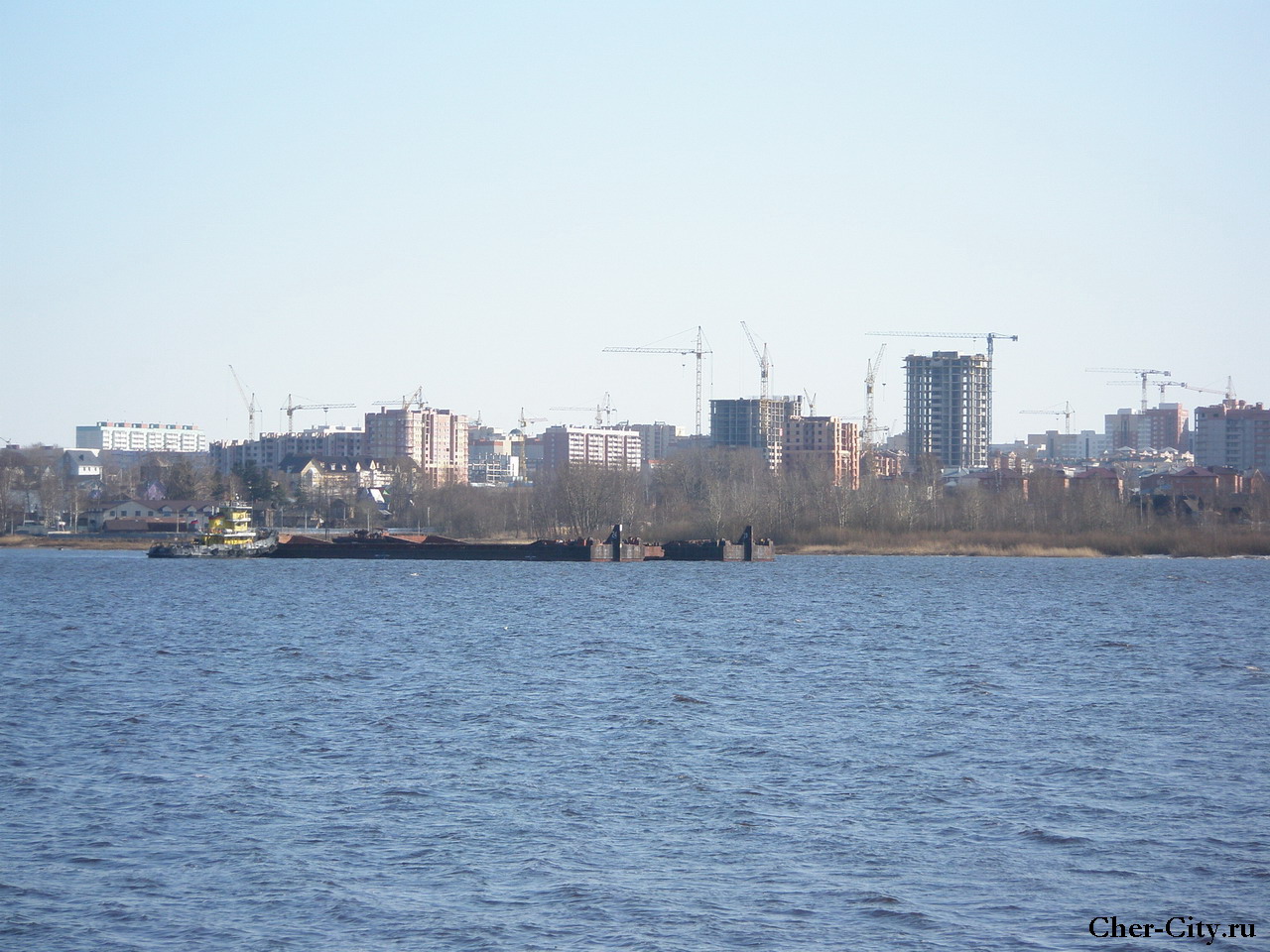 Строительство в 105-м и 106-м микрорайонах Череповца. Вид с противоположного берега реки Шексна. Конец апреля 2009 г.