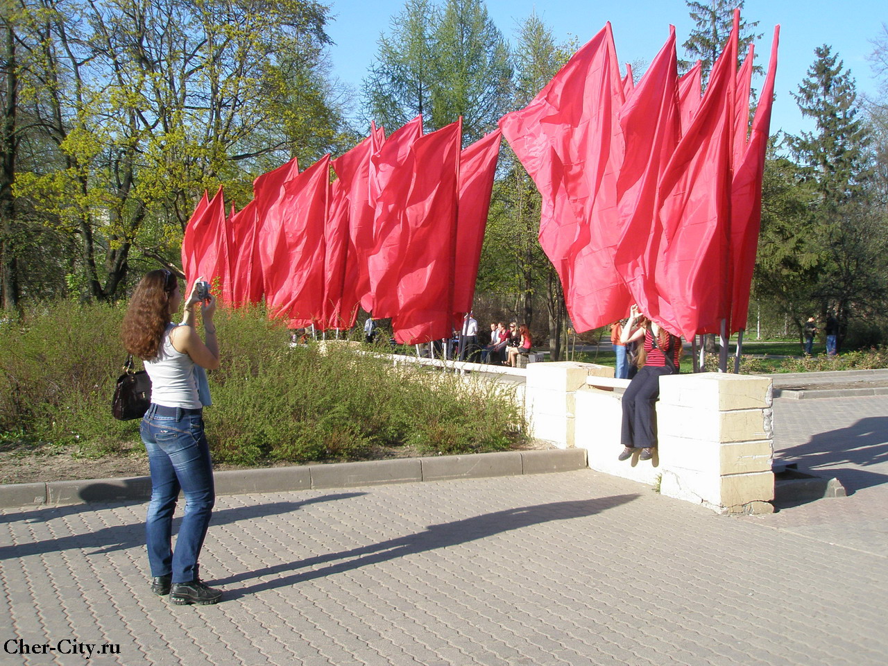 Девушки фотографируются на фоне красных флагов. Площадь металлургов, 9 мая 2009 г.