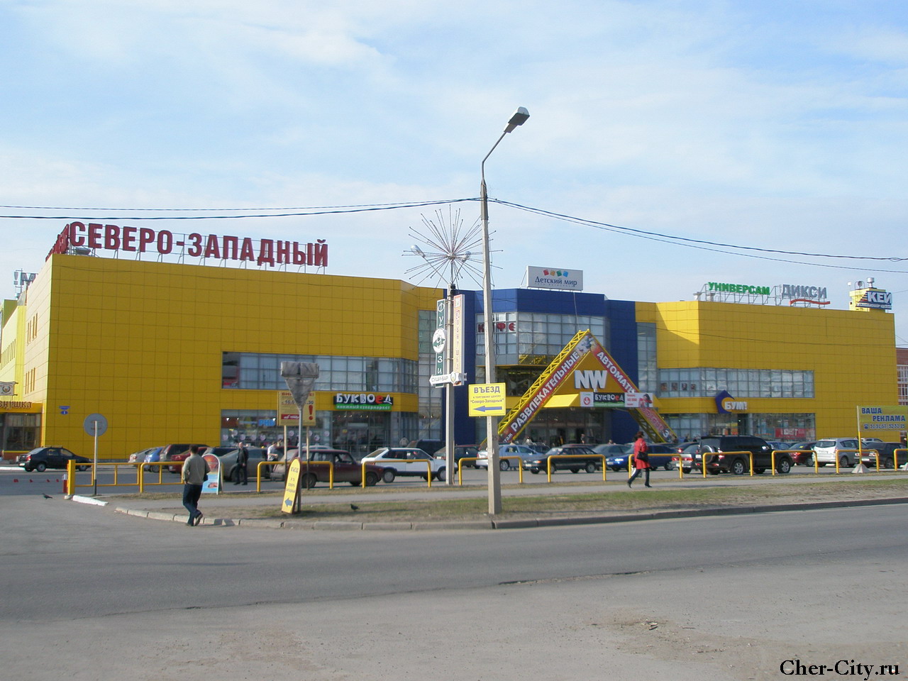 Торговый центр "Северо-Западный" - один из крупнейших в Череповце. Находится на пересечении Октябрьского проспекта и Ленинградской улицы. Конец апреля 2009 г.