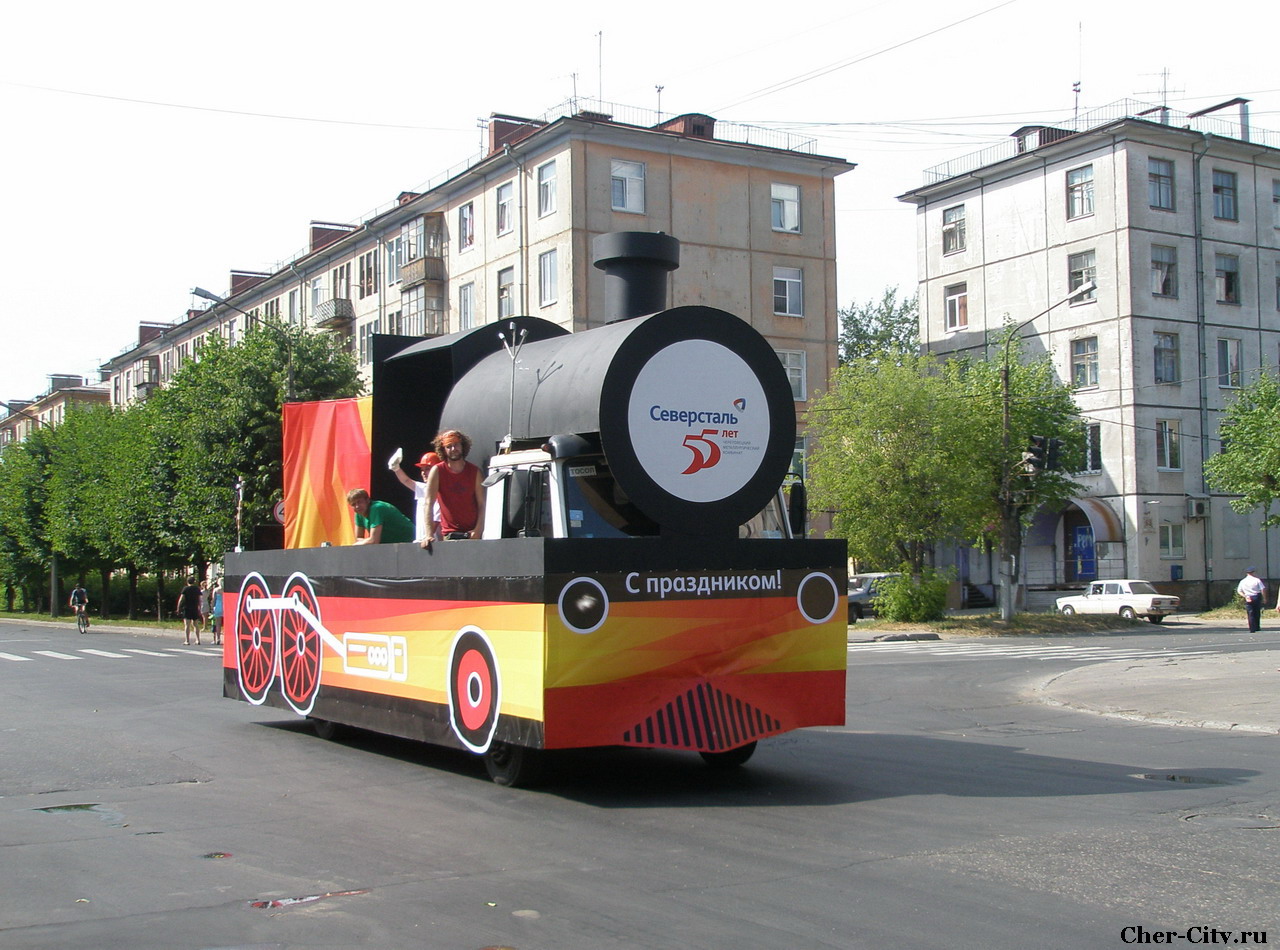 Паровозик перед колонной транспортного цеха, перекресток улицы Ленина и бульвара Доменщиков.